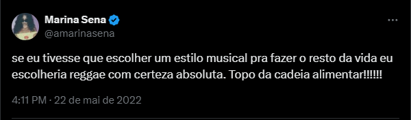 Outro estilo que se repete no álbum é o reggaeton, que está presente nas faixas Me Ganhar e Sonho Bom. O gênero latino combina com Marina, pois une o rap – estilo no qual recentemente colaborou com o rapper BK – com o reggae, ritmo pelo qual a cantora já manifestou seu apreço no tweet reproduzido abaixo.